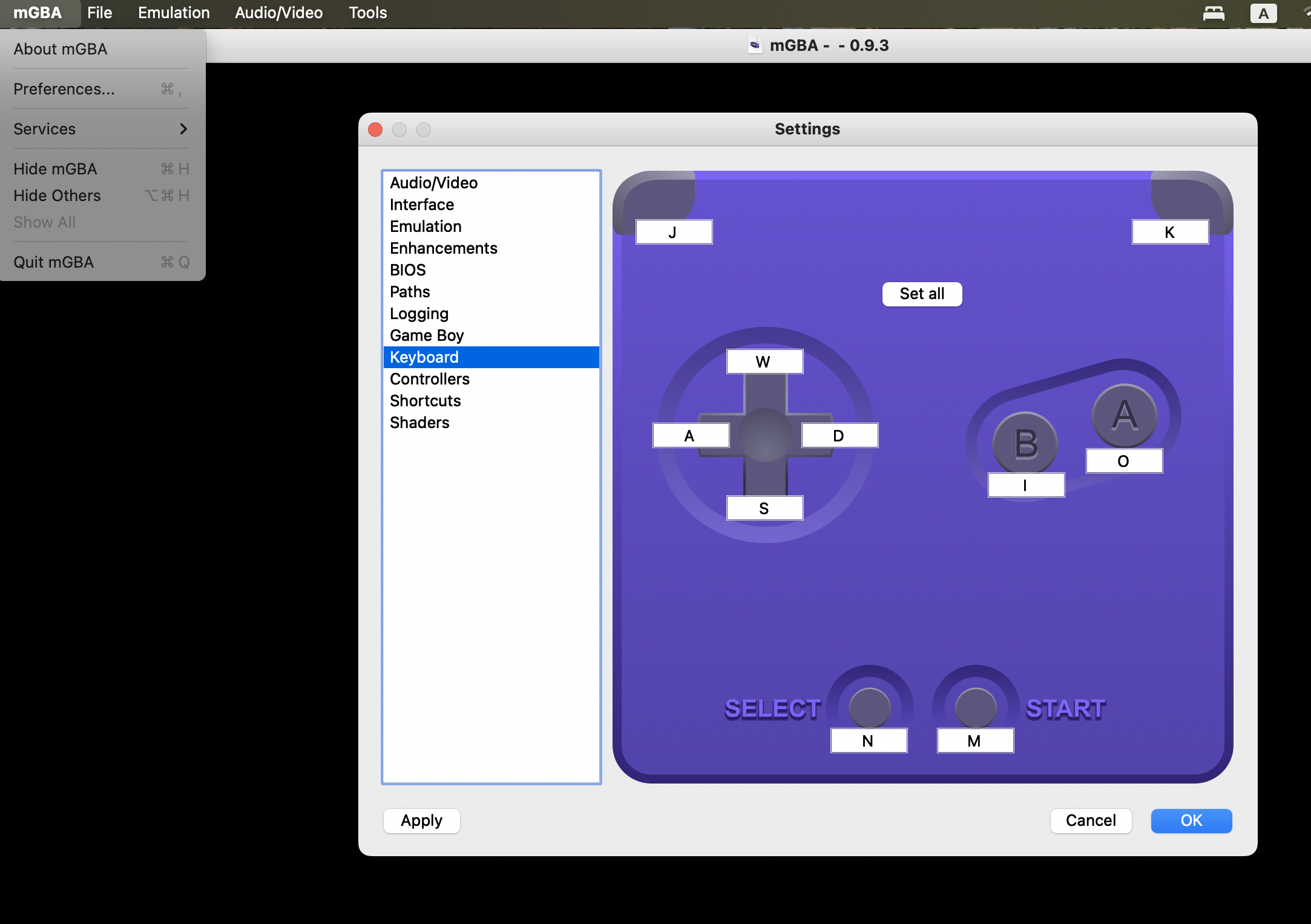TO CHANGE THE CONTROLS, click on mGBA>preferences>keyboard